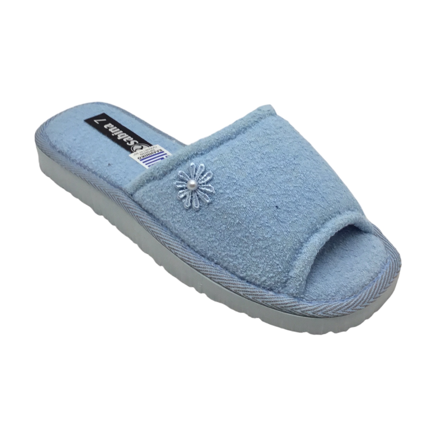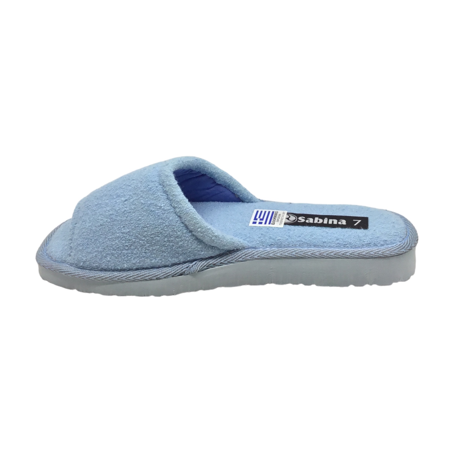 Γυναικείες παντόφλες καλοκαιρινές Sabina από 100% πετσέτα, με μαλακό αναπαυτικό πέλμα και αντιολισθητική σόλα. Διαθέτουν κανονική φόρμα. Προϊόν ελληνικής κατασκευής.