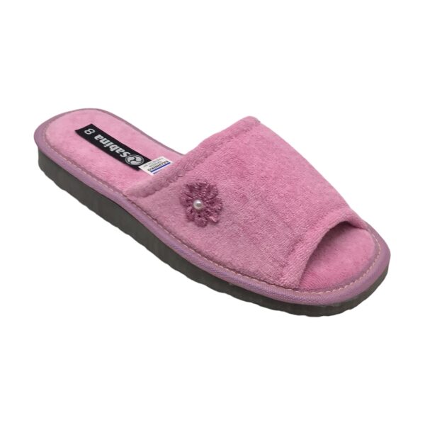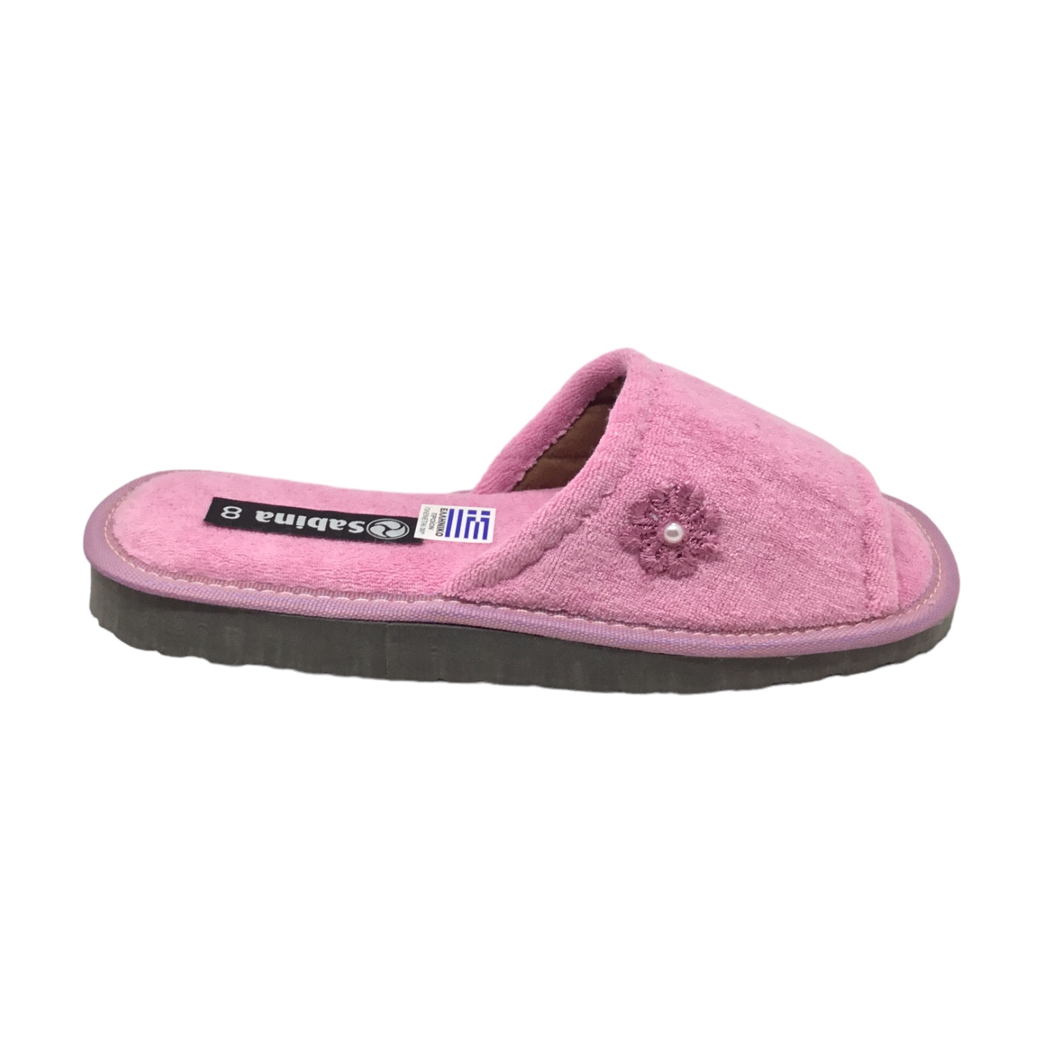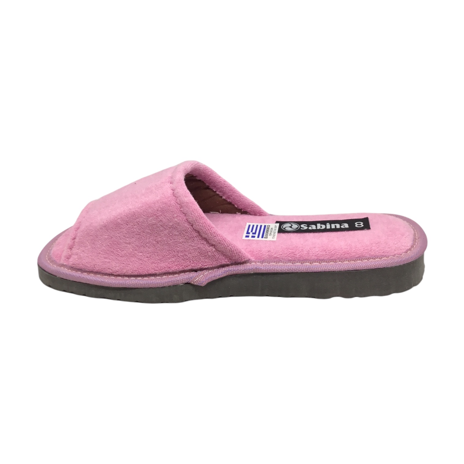 Γυναικείες παντόφλες καλοκαιρινές Sabina από 100% πετσέτα, με μαλακό αναπαυτικό πέλμα και αντιολισθητική σόλα. Διαθέτουν κανονική φόρμα. Προϊόν ελληνικής κατασκευής.