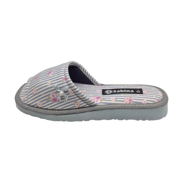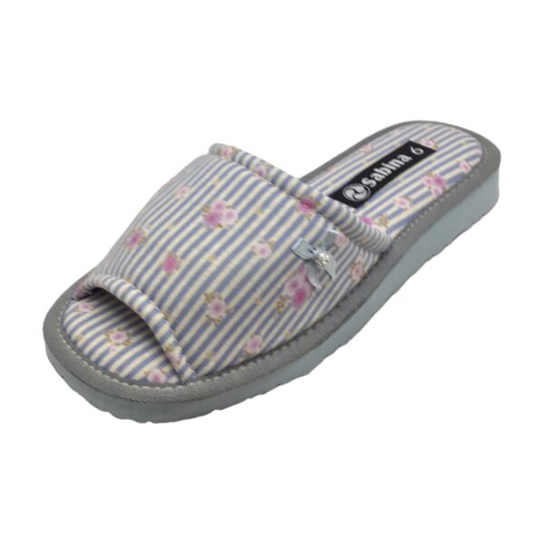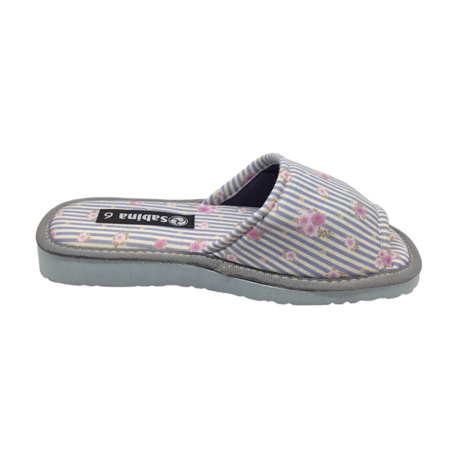 Γυναικείες παντόφλες καλοκαιρινές Sabina από 100% βαμβάκι , με μαλακό αναπαυτικό πέλμα και αντιολισθητική σόλα. Διαθέτουν κανονική φόρμα. Προϊόν ελληνικής κατασκευής.