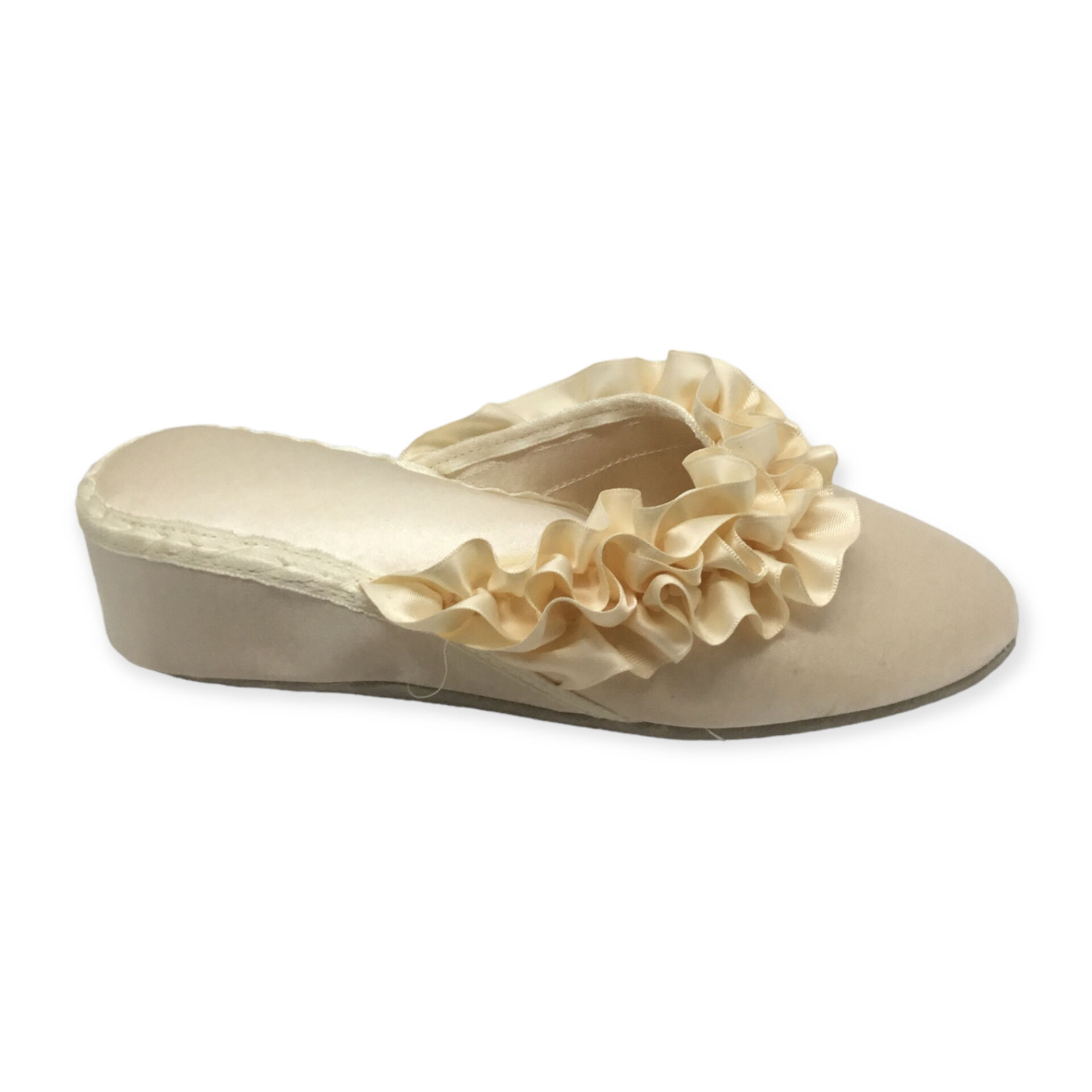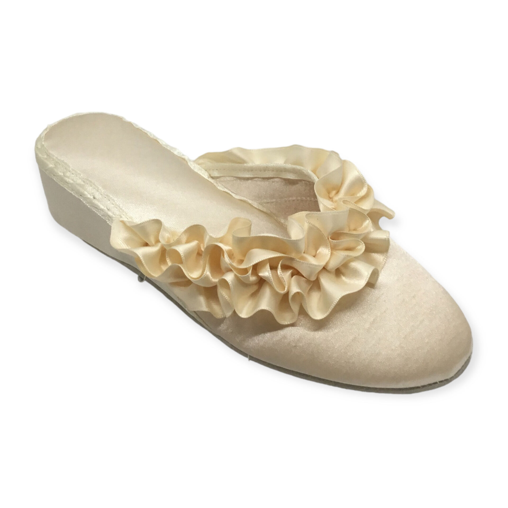 Νυφικές παντόφλες σατέν χειροποίητες με μονοκόμματο τακούνι. Εξωτερικά και εσωτερικά είναι κατασκευασμένες από ύφασμα σατέν, όπως επίσης και η σόλα τους είναι επενδυμένη από γνήσιο δέρμα.